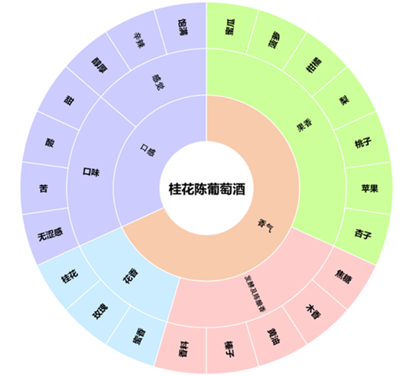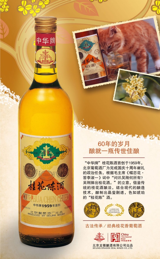 龍徽桂花陳葡萄酒用多年陳釀的精選優質白葡萄酒做酒基,桂花做香料。每年十一月桂花盛開季節,摘取含苞欲放的鮮桂花,經過加工后,酒液浸制,精心調配,使其氣質和品味都達到充分的諧調,才可成為優質的成品酒。其色澤金澤,純凈清澈,既有桂花的淡雅清香,又不失葡萄酒的醇厚芳香,酸甜適當,余味悠長。