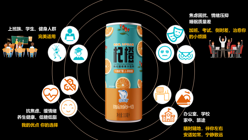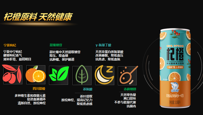 杞橙是一款具有枸杞甜橙風味的無糖抗焦慮飲料,選用寧夏“中寧枸杞”壓榨的鮮枸杞汁和“西鳳臍橙”濃縮橙汁,完整的保留了果汁中的主要活性成分枸杞多糖、β胡蘿卜素、甜菜堿等,果香馥郁。杞橙中添加了具有放松神經及抗焦慮作用的天然安神解壓成分γ-氨基丁酸(GABA)和提取自茶葉的可提高學習和記憶能力的功能性成分L-茶氨酸。杞橙不添加蔗糖,選用植物甜味劑赤蘚糖醇和甜菊糖苷,符合現代人對低卡路里、無糖、無脂肪的健康生活方式。杞橙的抗焦慮的功效和0糖低脂的配方優點,完美適用于上班族、學生、健身人群,在加班、考試、倒時差的時候,舒緩你的情緒,治愈你的小煩躁;在辦公室、學校、家中、旅途中無負擔暢飲,讓你安適如常,寧靜致遠。